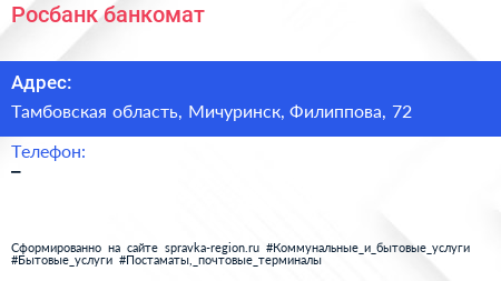 Росбанк, банкомат по адресу Тамбовская область, Мичуринск, Филиппова, 72 в дальнейшем Организация, размещена в следующих категориях: