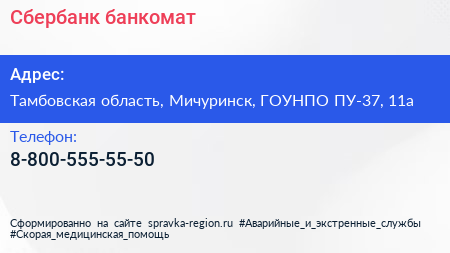 Сбербанк, банкомат по адресу Тамбовская область, Мичуринск, ГОУНПО ПУ-37, 11а в дальнейшем Организация, размещена в следующих категориях: