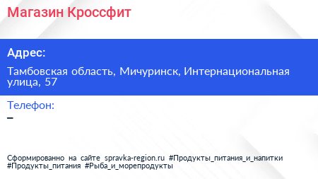 Магазин Кроссфит по адресу Тамбовская область, Мичуринск, Интернациональная улица, 57 в дальнейшем Организация, размещена в следующих категориях: