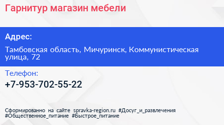 Гарнитур, магазин мебели по адресу Тамбовская область, Мичуринск, Коммунистическая улица, 72 в дальнейшем Организация, размещена в следующих категориях: