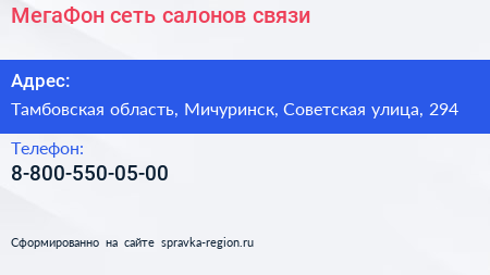 МегаФон, сеть салонов связи по адресу Тамбовская область, Мичуринск, Советская улица, 294 в дальнейшем Организация, размещена в следующих категориях: