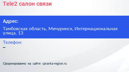 Tele2, салон связи по адресу Тамбовская область, Мичуринск, Интернациональная улица, 13 в дальнейшем Организация, размещена в следующих категориях:
