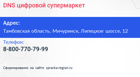 DNS, цифровой супермаркет по адресу Тамбовская область, Мичуринск, Липецкое шоссе, 12 в дальнейшем Организация, размещена в следующих категориях: