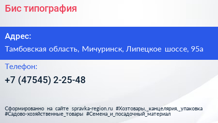 Бис, типография по адресу Тамбовская область, Мичуринск, Липецкое шоссе, 95а в дальнейшем Организация, размещена в следующих категориях: