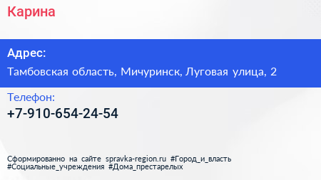 Карина по адресу Тамбовская область, Мичуринск, Луговая улица, 2 в дальнейшем Организация, размещена в следующих категориях: