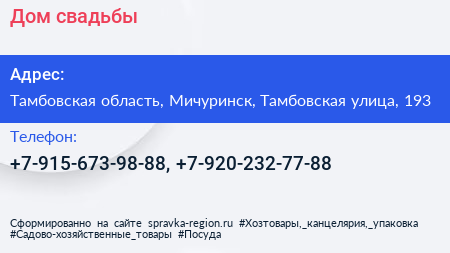 Дом свадьбы по адресу Тамбовская область, Мичуринск, Тамбовская улица, 193 в дальнейшем Организация, размещена в следующих категориях: