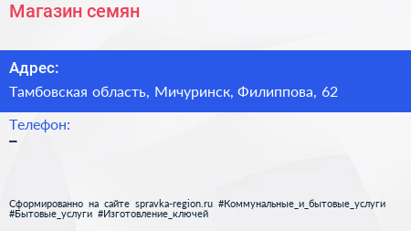 Магазин семян по адресу Тамбовская область, Мичуринск, Филиппова, 62 в дальнейшем Организация, размещена в следующих категориях: