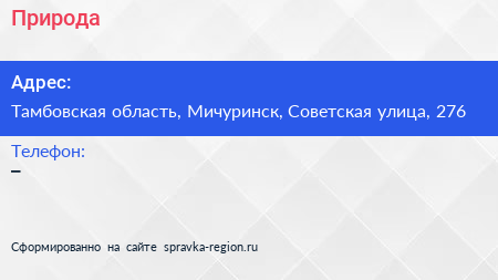 Природа по адресу Тамбовская область, Мичуринск, Советская улица, 276 в дальнейшем Организация, размещена в следующих категориях: