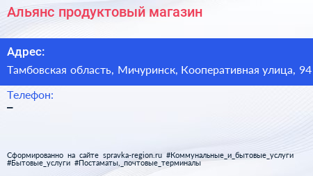 Альянс, продуктовый магазин по адресу Тамбовская область, Мичуринск, Кооперативная улица, 94 в дальнейшем Организация, размещена в следующих категориях: