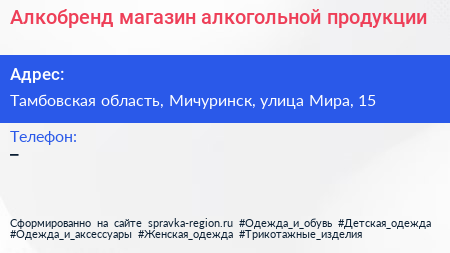Алкобренд, магазин алкогольной продукции по адресу Тамбовская область, Мичуринск, улица Мира, 15 в дальнейшем Организация, размещена в следующих категориях: