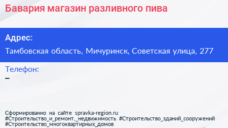 Бавария, магазин разливного пива по адресу Тамбовская область, Мичуринск, Советская улица, 277 в дальнейшем Организация, размещена в следующих категориях: