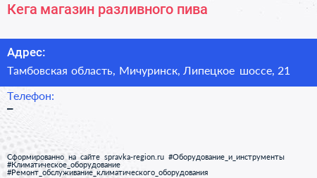 Кега, магазин разливного пива по адресу Тамбовская область, Мичуринск, Липецкое шоссе, 21 в дальнейшем Организация, размещена в следующих категориях: