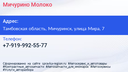 Мичурино Молоко по адресу Тамбовская область, Мичуринск, улица Мира, 7 в дальнейшем Организация, размещена в следующих категориях: