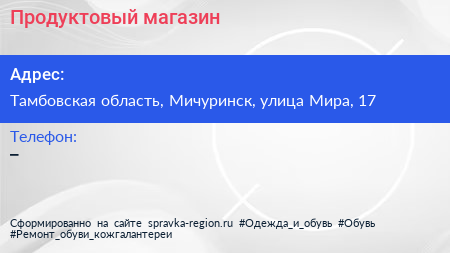Продуктовый магазин по адресу Тамбовская область, Мичуринск, улица Мира, 17 в дальнейшем Организация, размещена в следующих категориях: