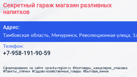 Секретный гараж, магазин разливных напитков по адресу Тамбовская область, Мичуринск, Революционная улица, 1а в дальнейшем Организация, размещена в следующих категориях: