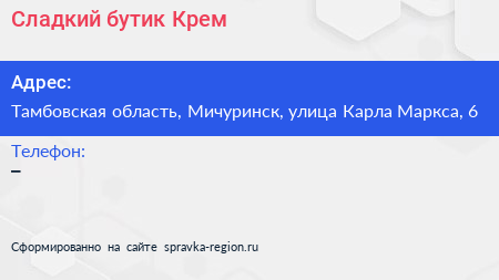 Сладкий бутик Крем по адресу Тамбовская область, Мичуринск, улица Карла Маркса, 6 в дальнейшем Организация, размещена в следующих категориях: