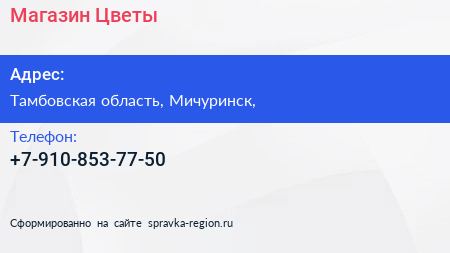 Магазин Цветы по адресу Тамбовская область, Мичуринск, в дальнейшем Организация, размещена в следующих категориях: