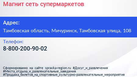 Магнит, сеть супермаркетов по адресу Тамбовская область, Мичуринск, Тамбовская улица, 108 в дальнейшем Организация, размещена в следующих категориях: