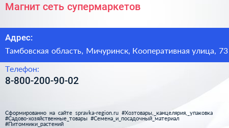 Магнит, сеть супермаркетов по адресу Тамбовская область, Мичуринск, Кооперативная улица, 73 в дальнейшем Организация, размещена в следующих категориях: