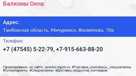 Балконы+Окна по адресу Тамбовская область, Мичуринск, Филиппова, 70а в дальнейшем Организация, размещена в следующих категориях: