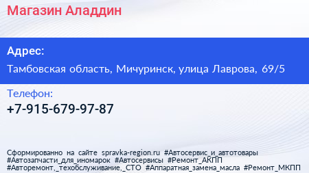 Магазин Аладдин по адресу Тамбовская область, Мичуринск, улица Лаврова, 69/5 в дальнейшем Организация, размещена в следующих категориях: