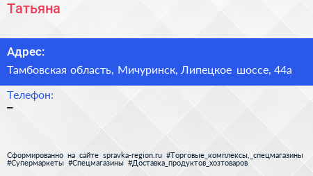 Татьяна по адресу Тамбовская область, Мичуринск, Липецкое шоссе, 44а в дальнейшем Организация, размещена в следующих категориях: