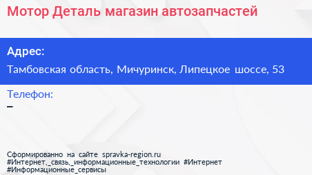 Мотор Деталь, магазин автозапчастей по адресу Тамбовская область, Мичуринск, Липецкое шоссе, 53 в дальнейшем Организация, размещена в следующих категориях: