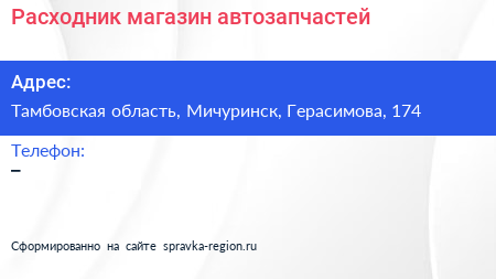 Расходник, магазин автозапчастей по адресу Тамбовская область, Мичуринск, Герасимова, 174 в дальнейшем Организация, размещена в следующих категориях: