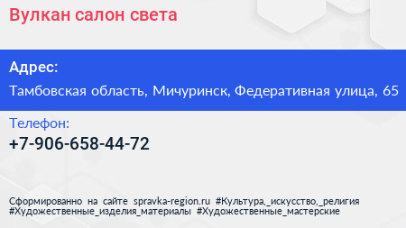 Вулкан, салон света по адресу Тамбовская область, Мичуринск, Федеративная улица, 65 в дальнейшем Организация, размещена в следующих категориях: