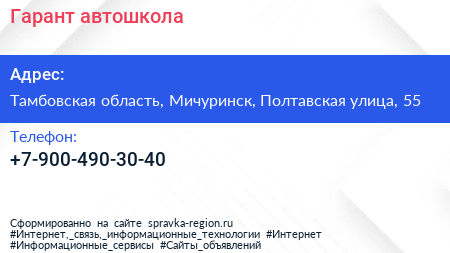 Гарант, автошкола по адресу Тамбовская область, Мичуринск, Полтавская улица, 55 в дальнейшем Организация, размещена в следующих категориях: