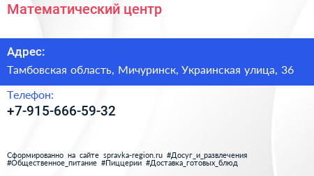 Математический центр по адресу Тамбовская область, Мичуринск, Украинская улица, 36 в дальнейшем Организация, размещена в следующих категориях: