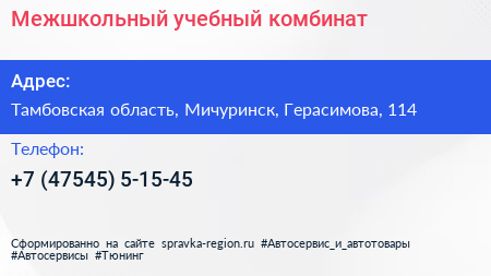 Межшкольный учебный комбинат по адресу Тамбовская область, Мичуринск, Герасимова, 114 в дальнейшем Организация, размещена в следующих категориях: