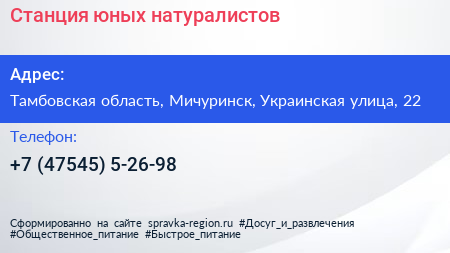 Станция юных натуралистов по адресу Тамбовская область, Мичуринск, Украинская улица, 22 в дальнейшем Организация, размещена в следующих категориях: