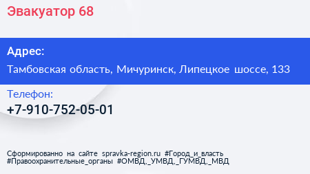 Эвакуатор 68 по адресу Тамбовская область, Мичуринск, Липецкое шоссе, 133 в дальнейшем Организация, размещена в следующих категориях: