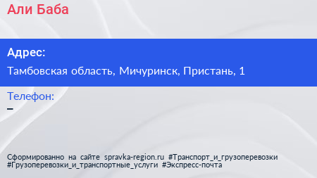 Али-Баба по адресу Тамбовская область, Мичуринск, Пристань, 1 в дальнейшем Организация, размещена в следующих категориях: