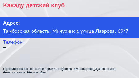 Какаду, детский клуб по адресу Тамбовская область, Мичуринск, улица Лаврова, 69/7 в дальнейшем Организация, размещена в следующих категориях: