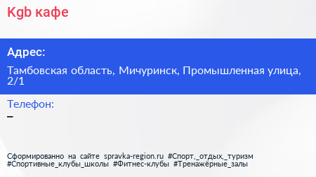 Kgb, кафе по адресу Тамбовская область, Мичуринск, Промышленная улица, 2/1 в дальнейшем Организация, размещена в следующих категориях: