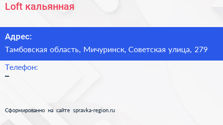 Loft, кальянная по адресу Тамбовская область, Мичуринск, Советская улица, 279 в дальнейшем Организация, размещена в следующих категориях: