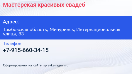 Мастерская красивых свадеб по адресу Тамбовская область, Мичуринск, Интернациональная улица, 83 в дальнейшем Организация, размещена в следующих категориях: