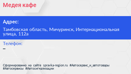 Медея, кафе по адресу Тамбовская область, Мичуринск, Интернациональная улица, 112а в дальнейшем Организация, размещена в следующих категориях: