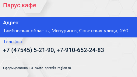 Парус, кафе по адресу Тамбовская область, Мичуринск, Советская улица, 260 в дальнейшем Организация, размещена в следующих категориях: