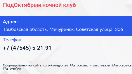 ПодОктябрем, ночной клуб по адресу Тамбовская область, Мичуринск, Советская улица, 306 в дальнейшем Организация, размещена в следующих категориях: