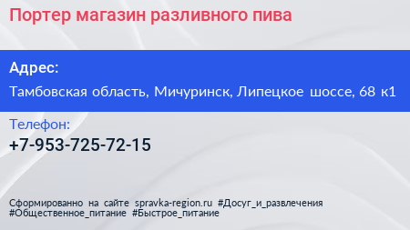 Портер, магазин разливного пива по адресу Тамбовская область, Мичуринск, Липецкое шоссе, 68 к1 в дальнейшем Организация, размещена в следующих категориях: