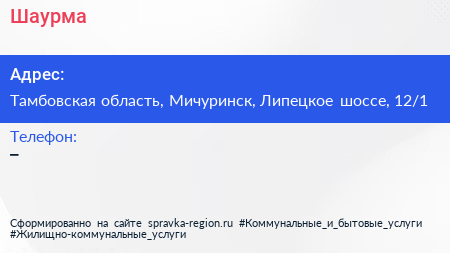 Шаурма по адресу Тамбовская область, Мичуринск, Липецкое шоссе, 12/1 в дальнейшем Организация, размещена в следующих категориях:
