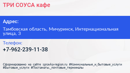 ТРИ СОУСА, кафе по адресу Тамбовская область, Мичуринск, Интернациональная улица, 3 в дальнейшем Организация, размещена в следующих категориях: