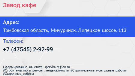 Завод, кафе по адресу Тамбовская область, Мичуринск, Липецкое шоссе, 113 в дальнейшем Организация, размещена в следующих категориях: