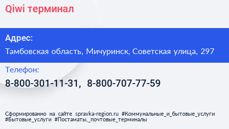 Qiwi, терминал по адресу Тамбовская область, Мичуринск, Советская улица, 297 в дальнейшем Организация, размещена в следующих категориях: