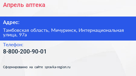 Апрель, аптека по адресу Тамбовская область, Мичуринск, Интернациональная улица, 97а в дальнейшем Организация, размещена в следующих категориях: