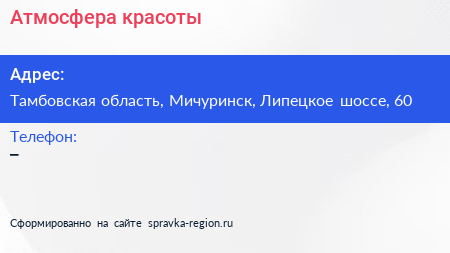 Атмосфера красоты по адресу Тамбовская область, Мичуринск, Липецкое шоссе, 60 в дальнейшем Организация, размещена в следующих категориях: