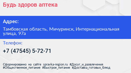 Будь здоров, аптека по адресу Тамбовская область, Мичуринск, Интернациональная улица, 97а в дальнейшем Организация, размещена в следующих категориях: